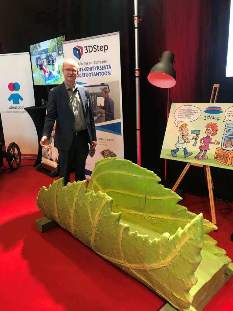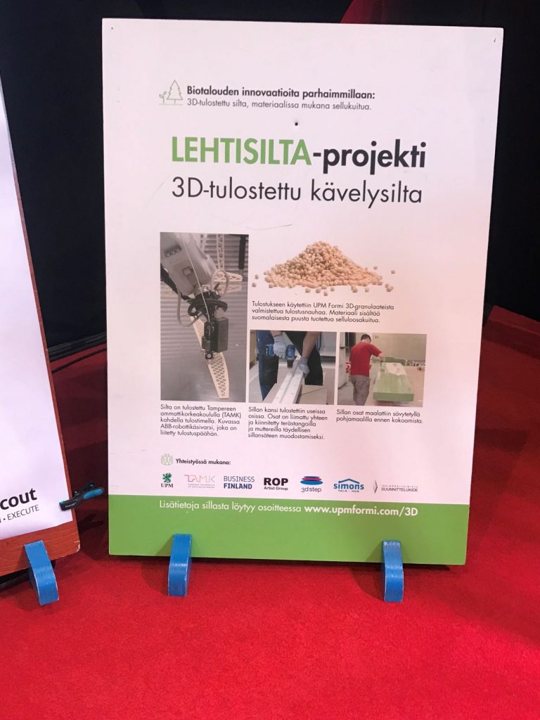 Esimerkkinä biomimiikasta oli messuilla esillä ollut tutkimusryhmän työn tuloksena syntynyt, yhteisesti kehitetty 3D-tulostettu silta. Kyseessä on co-creation (=yhteisesti kehitetty) teknologia -, johon kukin osapuoli on tuonut oman osaamisensa.