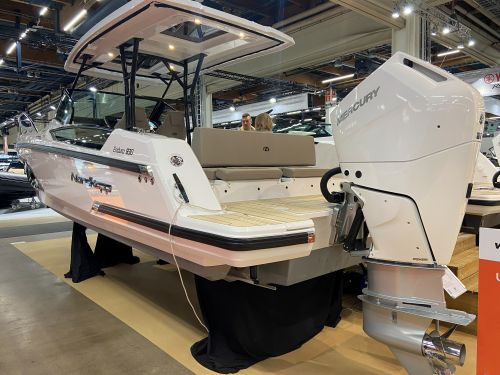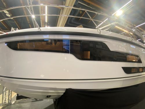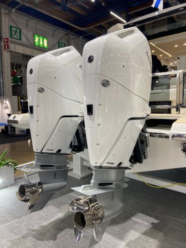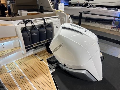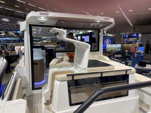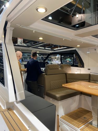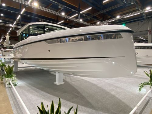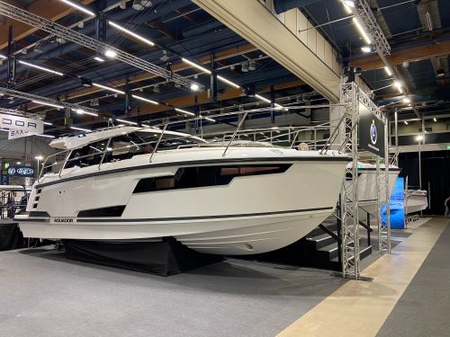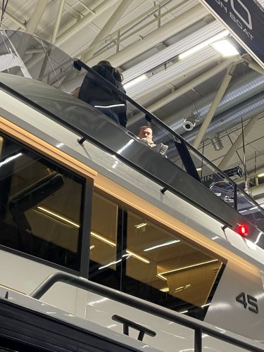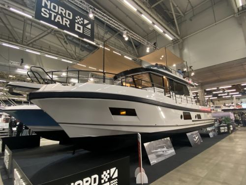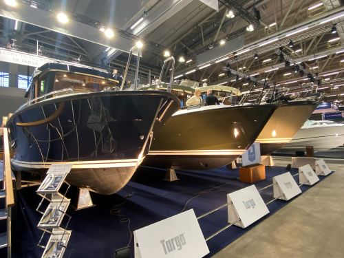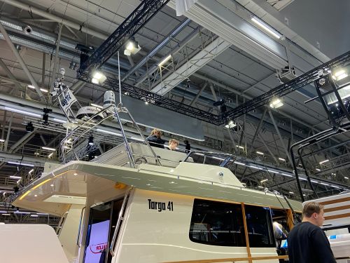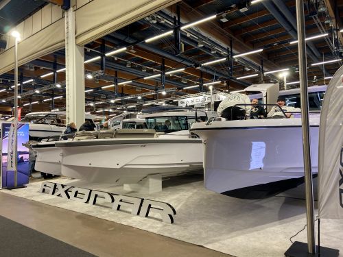 Kuvakavalkadimme lähtee liikkeelle messujen suuremmista moottoriveneistä.